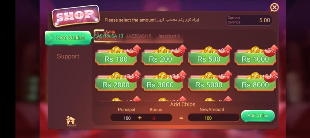 Convert game chips into actual money and withdraw via JazzCash, Easypaisa, or bank transfer.
